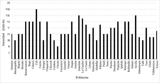 Los valores de intensidad presentados en la Tabla 4 y la Figura 5 muestran que a la ciudad de Santiago de Cali se le ha asignado el mayor nivel de intensidad, clasificada con daños severos (VIII), debido a que se dieron afectaciones serias e incluso colapsos parciales en muchas de las edificaciones presentes para la época del evento, lo que causó pánico extremo entre los habitantes de la ciudad.