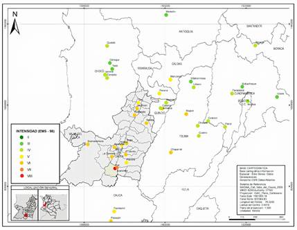 En la Figura 6 se presenta el mapa de puntos de intensidad macrosísmica, donde se distribuyen las intensidades asignadas, en la escala EMS-98, a cada una de las 42 poblaciones que, de acuerdo con los datos reportados por las diferentes fuentes de información, han sido afectadas por dicho evento sísmico (ver Tabla 4). Puede observarse que estos puntos geográficamente se distribuyen principalmente en los departamentos del Valle del Cauca, Tolima, Cundinamarca, Chocó, Quindío y Cauca; también se tienen puntos de intensidad en los departamentos de Risaralda, Caldas, Antioquia y Boyacá. El Valle del Cauca es el departamento con mayor número de poblaciones afectadas, específicamente 13 municipios con reportes de algún tipo de afectación.