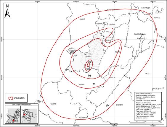 Dicho mapa de intensidades muestra que la distribución geográfica de los puntos de intensidad marca una ligera tendencia SSO-NNE, donde los mayores valores se asignan a las poblaciones ubicadas en el departamento del Valle del Cauca, en un rango de intensidad que va desde V hasta VIII, cuyo valor máximo se reporta en la ciudad de Cali. A partir de aquí, se nota el decaimiento de la intensidad tanto hacia el NNE como hacia el SSO, marcando mayor elongación hacia el NNE, situación que se marca claramente en el trazado de las curvas de isosistas obtenido a partir de este estudio. Con el mapa de isosistas se logró proponer el epicentro macrosísmico, que preliminarmente estaría ubicado en las coordenadas 3,45° norte y 76,49° oeste.