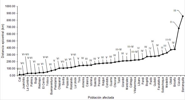 El epicentro macrosísmico, preliminarmente definido en este trabajo, ha sido ubicado en las coordenadas 3,45° de latitud norte y 76,49° de longitud oeste, cerca de la ciudad de Cali, y se asocia con el sistema de falla Cali-Patía (París y Romero, 1994; Nivia, 2001), que, como lo muestra la Figura 1, representa el límite oriental de la secuencia del Cretáceo superior de la cordillera Occidental y controla además el límite occidental del valle aluvial del río Cauca (Nivia, 2001). En la Figura 8 se muestra una relación entre la intensidad y la distancia al epicentro de cada una de las poblaciones afectadas por el terremoto sísmico del 07 de junio de 1925, según las asignaciones del presente estudio.