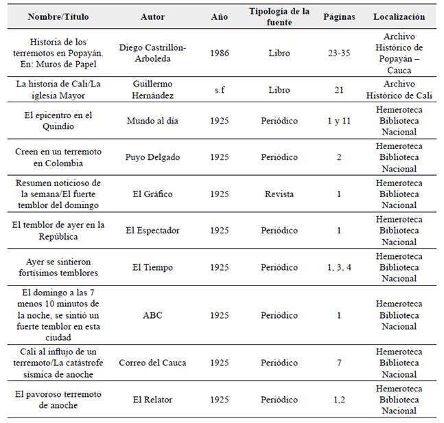 Se trata de información obtenida de los archivos, se caracteriza por ser escritos o relatos de testigos sobre los efectos del terremoto. En este sentido, se realizó la visita al Archivo General de la Nación, en la ciudad de Bogotá; al Archivo Central del Cauca, en la ciudad de Popayán; al Archivo Histórico Municipal de Cali, en la ciudad de Cali, y a los Archivos Históricos de Cartago y Buga, en los municipios de Cartago y Buga, respectivamente. En Bogotá, se realizaron visitas, a su vez, a la Academia Colombiana de Ciencias Naturales, Físicas y Exactas, en la ciudad de Bogotá y a la Hemeroteca Nacional. También se realizaron búsquedas, aunque no siempre fructíferas en la consecución de noticias relacionadas con este evento, en la Biblioteca Luis Ángel Arango; Biblioteca del Banco de la República, en las ciudades de Cali y Popayán, Biblioteca de la Universidad del Valle y Centro de Documentación del Departamento de Historia de la Universidad del Valle, en la ciudad de Cali. El Anexo 1 presenta el listado de las fuentes primarias consultadas (información proveniente de libros, periódicos y revistas) para el presente estudio.