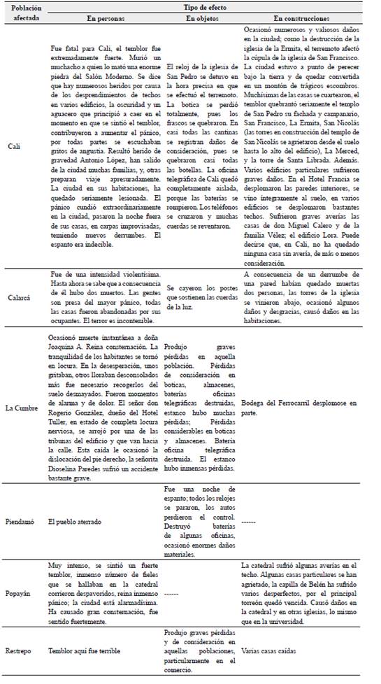Principales efectos en personas, objetos y construcciones: fueron diversos los efectos reportados por los habitantes de las poblaciones donde el sismo del 07 de junio de 1925 fue sentido o produjo daños. La información al respecto fue extraída de las diferentes fuentes bibliográficas descritas anteriormente. Es importante tener en cuenta que para la descripción de los efectos se hizo la transcripción exacta de cómo la población percibió y relató el acontecimiento, esto con el fin de realizar la asignación de la intensidad con la Escala Macrosísmica Europea (EMS-98). Los efectos en objetos se manifiestan en el sentido de que diversos elementos observados por las personas, se balancean, caen y, en muchos casos, se rompen a causa de la vibración sísmica. Al igual que los efectos en personas, para la determinación de intensidades, es necesario mostrar la información puntual de los efectos en objetos ocasionados por el evento sísmico. Por último, se tiene que las afectaciones en construcciones pueden impactar seriamente en el estado y la calidad de las viviendas, que pueden llegar a sufrir colapso parcial o incluso total de las mismas. Esto provocaría más consecuencias e incremento de la intensidad macrosísmica. En el Anexo 3 se muestra, de manera resumida, los efectos principales causados en las personas, objetos y construcciones en algunas de las poblaciones donde las diversas fuentes consultadas indican algún tipo de afectación provocada por el terremoto del 07 de junio de 1925. Se nota que los mayores efectos fueron reportados en la ciudad de Cali.
