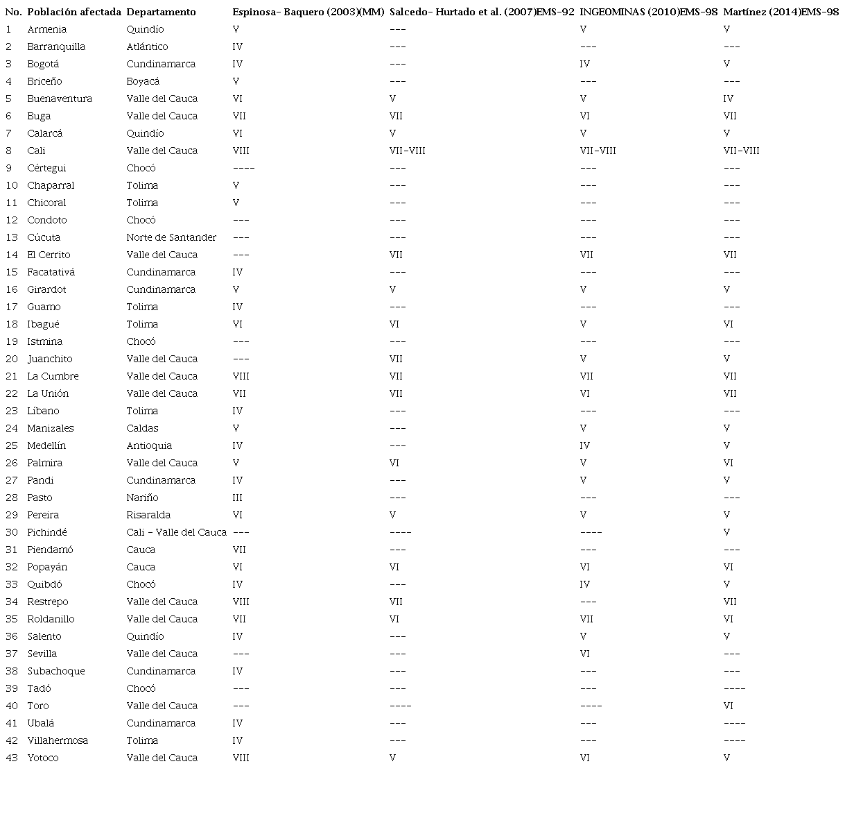 Se puede apreciar que en el caso del estudio de Espinosa-Baquero (2003), se asigna intensidad de VIII a las poblaciones de Cali, La Cumbre, Restrepo y Yotoco. Los demás autores asignan un valor máximo de intensidad entre VII-VIII para la ciudad de Cali. Puede verse que no todas las poblaciones mencionadas en la Tabla 1 tienen asignaciones de intensidad, lo cual muestra un vacío de información macrosísmica que es complementado con la búsqueda de nueva información realizada en el presente estudio, como se muestra más adelante.