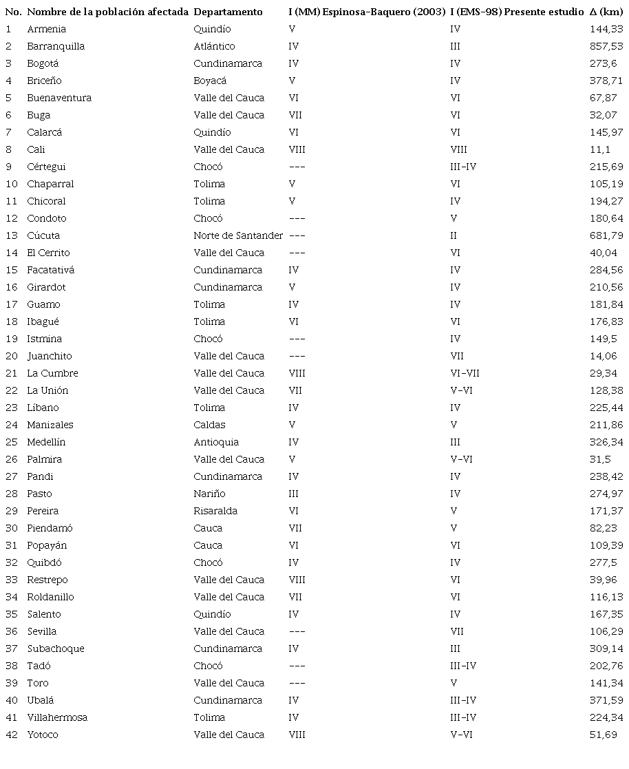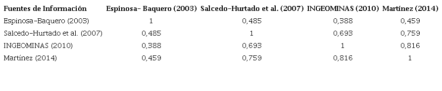 Como se puede apreciar, independientemente del tipo de escala macrosísmica utilizada en cada estudio, se nota muy baja correlación entre los valores de intensidad asignados; la mayor correlación se presenta en las asignaciones dadas por INGEOMINAS (2010) y Martínez (2014), con un coeficiente del orden de 0,82. La correlación que existe entre la evaluación hecha por Espinosa-Baquero (2003) con las demás fuentes es muy baja. El estudio de Espinosa-Baquero (2003) se toma como referencia debido a que es el que presenta la mayor cantidad de poblaciones evaluadas. Sin embargo, la evaluación de las intensidades en dicho estudio se realizó con base en la escala de Mercalli modificada, que, en los últimos años, en Colombia, ha entrado en desuso.
