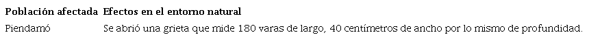 Efectos en el entorno natural: a pesar de que el evento sísmico del 07 de junio de 1925 ocasionó varios daños en la ciudad de Cali, no hubo reportes de efectos en el medio ambiente, tales como deslizamientos o eyección de lodo de manera súbita; por el contrario, el comportamiento de los suelos aparentemente fue estable, a excepción de la población de Piendamó en el departamento del Cauca, donde se reportaron efectos de este tipo (Tabla 3).