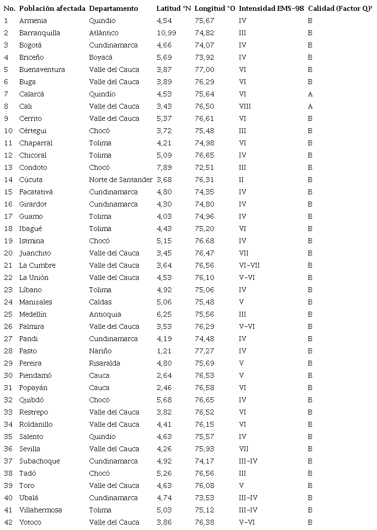 Obsérvese que la información utilizada, aunque para algunas poblaciones puede ser poca, ha permitido dar asignaciones de intensidad de buena calidad, a pesar de que algunos valores pueden ser intermedios, como es el caso de las intensidades asignadas a los municipios de La Cumbre y La Unión en el departamento del Valle del Cauca, donde se reportan valores de VI-VII y V-VI, respectivamente. Debe quedar claro que estos no corresponden a valores decimales de 6,5 y 5,5, esto significa que la información reportada, por ejemplo, para el caso del municipio de La Cumbre, contiene algunos elementos que permiten asignar intensidad de VI, pero además indica datos del nivel VII que no son suficientes para que este sea el valor final de la intensidad en dicha población.