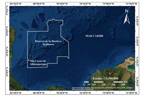 La Isla Cayos de Alburquerque (ICAlb) hace parte del departamento Archipiélago de San Andrés, Providencia y Santa Catalina, declarado como Reserva de Biosfera Seaflower (RBS) desde el año 2000 por la Organización de las Naciones Unidas para la Educación, la Ciencia y la Cultura (UNESCO); en el año 2005 contaba con un área aproximada de 180.000 km2, de los cuales menos del 1% eran áreas emergidas y una porción de 65.018 km2 como Área Marina Protegida (AMP) (Abril- Howard et al., 2012); hoy en día, la RBS cuenta con 106.000 km2 (Alvarado-Bedoya, 2014; Rojas, 2015).