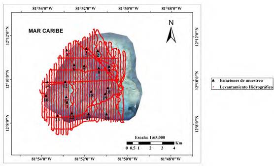 La caracterización de las unidades geomorfológicas se realizó a partir de técnicas acústicas y ópticas. Las técnicas acústicas a partir de datos batimétricos se usaron para conocer las profundidades de las unidades geomorfológicas. Este levantamiento se realizó a bordo de una lancha utilizando la ecosonda Monohaz ODOM HYDROTRAC II, con un transductor de 200 kHz y con una resolución de 50 m, conectado a un sistema de posicionamiento R7 TRIMBLE y un perfilador de velocidad de sonido AML MINOS X. El levantamiento se llevó a cabo entre el 2 y el 16 de octubre del 2018, en la Expedición Científica Seaflower 2018. Se realizaron desplazamientos paralelos equiespaciados a 200 m de distancia de cada recorrido. La información acústica se generó con sistemas de coordenadas UTM (Universal Transverse Mercator) y un datum WGS84. Se obtuvo un archivo XYZ; posterior a esto, se convirtieron a coordenadas geográficas, con un total de 4406 pulsos acústicos de la profundidad del fondo de la ICAlb (Figura 2).