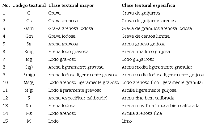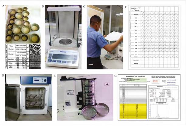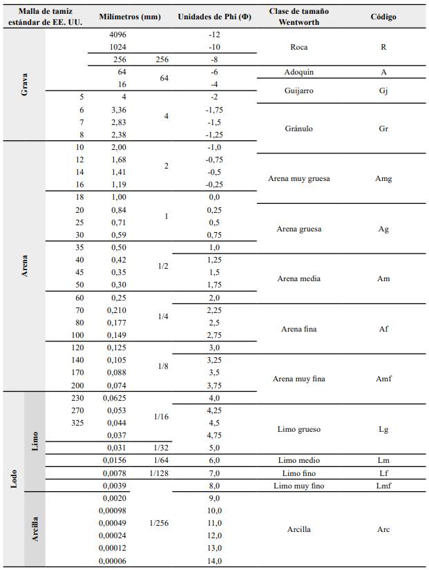 Análisis granulométrico: del sedimento extraído de cada muestra se pesaron 200 g en una balanza analítica digital OHAUS C-T-200 (Figura 3B y 3C), se colocaron en crisoles (Figura 3A) y después se secaron en un horno Symphony a 70°C por 48 h (Figura 3D). Al término del tiempo de secado, se pesaron 100 g de cada muestra seca (Figura 3B y 3C); posteriormente a esto, se incorporó cada muestra, durante 10 minutos, dentro de una máquina de tamizaje automática Tyler RX- 29, la cual presenta 13 compartimientos (Figura 3E), cuyos diámetros de malla están determinados con base en la clasificación del tamaño de grano de Wentworth (1922, citado y modificado por Boggs (2009)), y que se encuentran en una columna de forma ascendente, donde se diferencian las partículas de grano de mayor a menor tamaño de un sedimento no consolidado (Boggs, 2009). Esta clasificación se da en guijarro (4,75 mm), gránulo (3,35 mm y 2,00 mm), arena muy gruesa (1,18 mm), arena gruesa (600 μm y 500 μm), arena media (425 μm, 300 μm y 250 μm), arena fina (150 μm y 125 μm), arena muy fina (106 μm) y lodo (63 μm) (Tabla 2). Pasado el tiempo del tamizaje, se pesa la muestra de sedimento retenida en cada compartimiento, se registra el valor obtenido en un formato (Figura 3E) y se determina la clasificación textural según el tamaño de grano de Folk (1974) (Tabla 3).