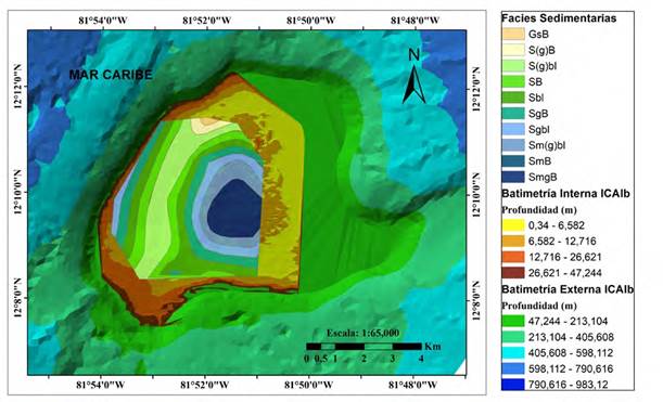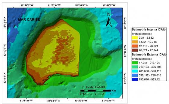 En el mapa de levantamiento acústico (Figura 4) se observan dos formatos de imagen en vista superficial, el primero en 2D, donde se visualiza dentro de la ICAlb la diferenciación de las unidades geomorfológicas con tonalidades amarillo a anaranjado, generadas por cambios de iluminación. La ICAlb presenta rangos de profundidades que varían entre -0,34 a -164,14 m y un promedio de -12,80 m. Los valores máximos de profundidad inician desde la periferia del atolón en -47,224 m. El segundo en 3D, tuvo en cuenta la capa de las profundidades externas a la isla cayos, y se observó un relieve estratificado con profundidades que varían entre -213,104 a -983,12 m.