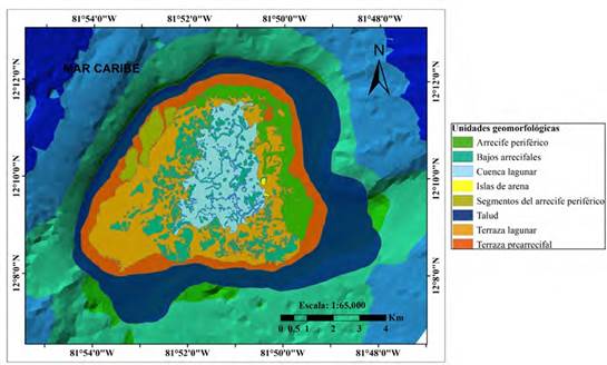 El análisis realizado a partir de la generación del MDB, en el uso de las imágenes Worldview-2, y del modelo DOP evidencia que la ICAlb presenta ocho (8) unidades geomorfológicas (Figura 5), caracterizado por un Talud ligeramente inclinado que cambia su ángulo abruptamente dando lugar a un cantil muy pronunciado hacia el margen de sotavento, con un área de 28,5158 km2 y un perímetro de 64,2363 km.