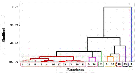 El análisis de clúster arrojó tres grupos y cuatro grupos aislados (Figura 6): el grupo I (G-I) formado por las E (1, 22, 6, 7, 4, 16, 12, 23, 17, 20 y 21); el grupo II (G-II) formado por las E (9 y 14); y el grupo III (G-III) formado por las E (8 y 10). Las E (2, 18, 19 y 3) son grupos aislados con denominación A1, A2, A3 y A4, respectivamente, y no son similares entre sí.
