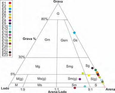 Se han determinado 10 facies sedimentarias (Tabla 8), el Talud presenta una variación en el tamaño de grano de 0,8 a 0,26 Φ (unidades de phi) con facies que van de SgB a Sgbl de moderada a pobremente seleccionadas y un contenido de CaCO3 entre 50 y 85% y >85%. Los tamaños de grano de la Terraza lagunar varían entre -1,34 a 2,31 Φ, de Gs a Ag a Am, con menor proporción Af con facies que varían entre GsB, SgB, Sb, S(g)B, Sgbl, S(g)bl y Sbl de moderada a pobremente seleccionadas, con contenido de CaCO3 entre 50 y 85%, y >85%. En cambio, la Cuenca lagunar se caracteriza por presentar una disminución en el tamaño de grano de 2,38 a 4,08 Φ de Smg a Sm, presentando facies que van de SmgB a SmB, con un porcentaje de CaCO3 >85%. Sin embargo, los Bajos arrecifales presentan variaciones en los tamaños de grano de 0,32 a 2,79 Φ, determinadas por Ag a Af de moderada a pobremente seleccionadas, de facies SgB, S(g)bl y Sm(g)bl con un contenido de CaCO3 entre 50 y 85%, en menor proporción mayores a 85%. En la Figura 9 se presenta el diagrama triangular con los puntos de cada muestra indicando la clasificación textural según el tamaño de grano.