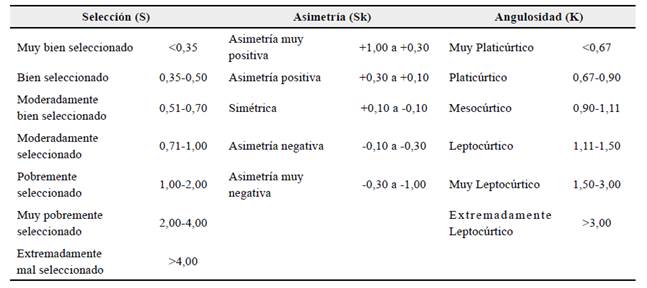 El análisis de la distribución de los sedimentos ha sido considerablemente usado por los geólogos para clasificar los ambientes sedimentarios y para explicar la dinámica del transporte (Venkatramanan et al., 2011). Según Abdulkarim et al. (2014), la composición de los sedimentos se ve afectada por la acción del oleaje y la marea, las corrientes litorales y la composición mineralógica de la costa, por lo que la distribución en el tamaño de grano del sedimento en una playa arenosa varía en función de las condiciones hidrodinámicas. La distribución de los sedimentos a lo largo de la playa es el resultado complejo de la interacción entre la fuente del sedimento, la energía del oleaje y la pendiente en la que la playa está establecida. La intensidad en la acción del oleaje en la zona litoral redeposita y ordena el tamaño de grano del sedimento; por lo tanto, la composición del sedimento de la playa no solo se ve afectada por la hidrodinámica, sino por la cantidad de materiales clásticos suministrados a la costa. Además, el tamaño de grano y la composición de carbonato de calcio son atributos que permiten la caracterización estructural del terreno de un lugar que condiciona las formas de vida presentes en los distintos ambientes, al tiempo que proporcionan información sobre los cambios del suelo, ya sea por causas naturales o antrópicas (Martínez-Clavijo, 2013). Los parámetros utilizados para describir la distribución de los sedimentos se dividen en cuatro grupos principales: a) el tamaño promedio, b) la desviación estándar de acuerdo con el promedio, c) la asimetría, d) la curtosis, el grado de concentración de los granos de acuerdo con el promedio (Blott y Pye, 2001).