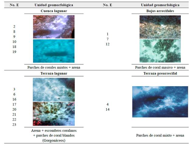 De las 19 estaciones (E) obtenidas, solo dos (2) muestras estaban ubicadas en la Terraza prearrecifal (E4, E14), nueve (9) muestras, en la Terraza lagunar (E3, E6, E7, E16, E17, E20, E21, E22, E23), tres (3) muestras ubicadas en los Bajos arrecifales (E1, E7, E12) y seis (6) en la Cuenca lagunar (E2, E8, E9, E10, E18, E19), como se muestra en la Figura 5.