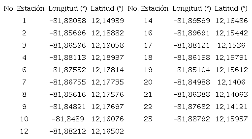 Para la toma de las muestras sedimentológicas se establecieron 24 estaciones, de las cuales solo se obtuvieron 19 estaciones (Figura 2), las restantes se encontraban encima de un parche coralino. En cada estación se tomaron muestras de sedimento superficial del fondo marino con una de draga AMS tipo Van Veen de 6” x 6”, operada desde una lancha; estas fueron empacadas en bolsas ziploc y rotuladas con el número de estación y su ubicación geográfica en grados decimales (Tabla 1).