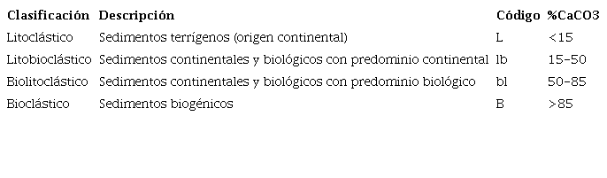 Calcimetría: esta técnica consiste en determinar la cantidad de carbonato de calcio (CaCO3) que contiene una muestra, lo cual permite definir su origen continental o biogénico. El término ‘lito’ significa que el sedimento proviene de la alteración física y/o química de cualquier roca lejana al sitio de depositación. El término ‘bio’ sugiere una formación de sedimentos por acumulación de organismos calcáreos; el origen en este caso es autóctono (Tabla 5). El contenido de CaCO3 se definió a partir de 0,25 g de sedimento normalizado adicionando 4 ml de ácido clorhídrico (HCl) al 10% y empleando el calcímetro de Bernard (Gutiérrez y Bernuil, 2004).