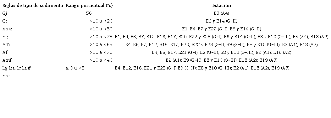 Se evidencia que la distribución porcentual de los tipos de sedimento es heterogénea; además, se observa que ninguna de las E tuvo sedimentos de tipo R y A. Se obtuvo tipos de sedimento dominantes entre Gj hasta Amf. Sin embargo, la composición de sedimentos de tipo lodo (Lg, Lm, Lf, Lmf y Arc) no fue dominante, así como se muestra en la Tabla 7.
