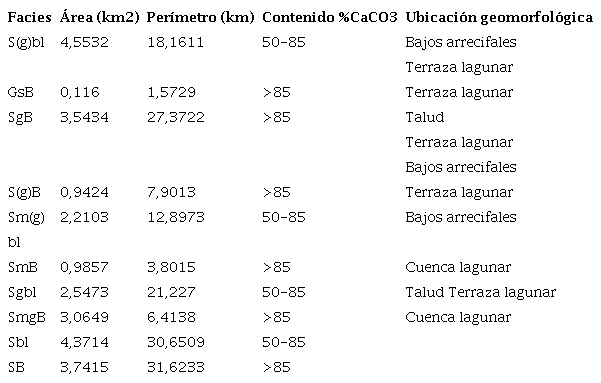 En cuanto a las facies sedimentarias, se determinó un alto porcentaje de facies gruesas cercanas al Talud y Bajos arrecifales, presentando una variación composicional de biolitoclásticos a bioclásticos en concordancia con lo determinado por Díaz et al. (2000), con un aporte lítico del basamento volcánico y un aporte biogénico de la barrera coralina, además de conchas y fragmentos de material esquelético orgánico (e.g. conchas de bivalvos y/o moluscos), con predominio del aporte de origen biogénico; en la parte central de los Bajos arrecifales hay una disminución del tamaño de grano. Estos sedimentos gruesos están de pobremente a moderadamente seleccionados, indicando un ambiente sedimentario de valores altos de energía cinética en el momento de la depositación. Las facies finas en un bajo porcentaje de distribución se presentan hacia la Cuenca lagunar con un aporte totalmente biogénico mayor al 85% de CaCO3, presentan una pobre selección y una asimetría positiva que indica valores bajos de energía cinética en el instante de la depositación.
