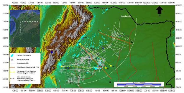 Para llevar adelante el análisis de esta región, se empleó información sísmica (13.930 km) y de pozos (71 sondeos) adquirida por la ANH durante los procesos licitatorios de áreas exploratorias, además de contar con información existente en la compañía. Con la información de los pozos exploratorios se graficó la información litológica disponible y datos bioestratigráficos existentes. A su vez, permitió la elaboración de sismogramas sintéticos, observándose una muy buena correspondencia entre los tiempos de arribo de las principales reflexiones observadas en la línea sísmica y los limites o topes formacionales.