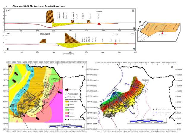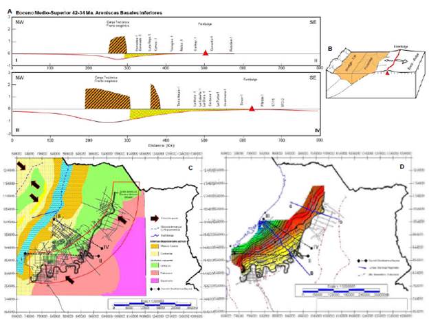 Se destacaron los aspectos sedimentarios y tectónicos vinculados a los niveles productivos (Formación Mirador y Miembro C7 englobados dentro de las Areniscas Basales) en la región suroriental y nororiental de la Cuenca de Llanos, en el marco de la evolución de un sistema de cuenca de antepaís. Desde el punto de vista tectono-sedimentario, a partir de la interpretación sísmica 2D y pozos exploratorios, se identificaron diferencias entre el sector suroriental y el sector nororiental del área de estudio. En el sector suroriental son claramente reconocibles rasgos vinculados con la migración del forebulge, tales como la reactivación de estructuras preexistentes y condensación de secuencia hacia altos estructurales. No es claro distinguir dichas peculiaridades hacia el sector nororiental de la cuenca.