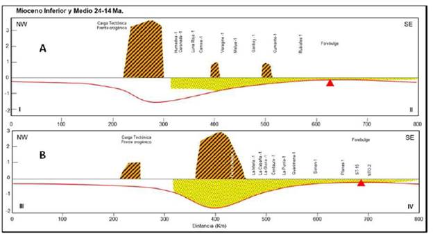 La Cuenca de Llanos está enmarcada en la evolución de un sistema de antepaís producto de la deflexión de la litosfera en respuesta a un conjunto de cargas. Para forjar esta deflexión, las fuerzas que actúan sobre la litosfera son la carga tectónica estática de la cuña orogénica, los sedimentos y el agua, y usualmente, la carga dinámica sublitosférica de la placa subductada. A través del tiempo, estas cargas migran o se redistribuyen conforme el sistema progresa. El abultamiento periférico vinculado con este proceso dinámico puede ser reconocido por el desarrollo erosivo de la discordancia basal (Beaumont, 1981; Waschbusch y Royden, 1992; Dolson y Piombino, 1994; Crampton y Allen, 1995; DeCelles y Giles, 1996; Currie, 1997; Catuneanu, 2004).
