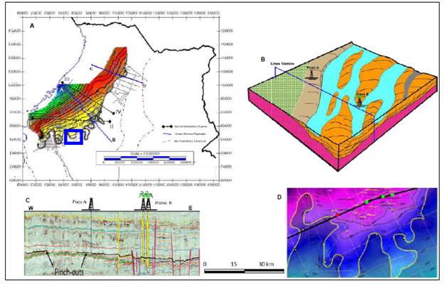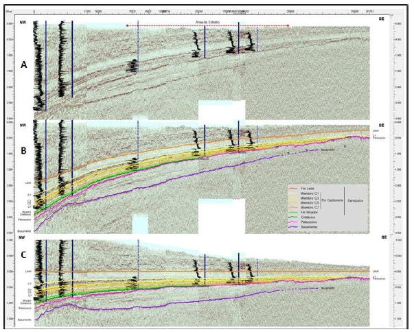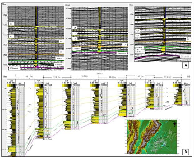 La información de pozos utilizada fueron registros de rayos gama y resistivo, empleando el criterio basado en la relación de facies, su apilamiento vertical y ajustado con el control de edades bioestratigráficas. De esta forma, se definieron las secuencias transgresivas que conforman los miembros C8 y C6, los cuales constituyen sendos marcadores regionales permitiendo la correlación de eventos, de igual forma que los miembros C4, C2 y la Formación León.