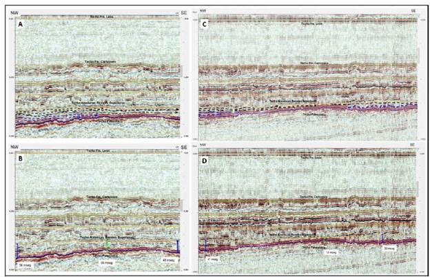 En general, la información sísmica es de buena calidad, los horizontes sísmicos interpretados, se caracterizan por poseer en la mayoría de los casos, una alta continuidad de reflexión, facilitando su propagación lateral al conjunto de líneas. La interpretación de los horizontes considerados claves; permitió la elaboración de mapas regionales estructurales en tiempo (isócronos) y planos isopáquicos (isocóricos), que en su conjunto nos permitieron caracterizar la región bajo estudio.