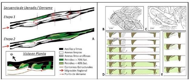 El arreglo de las litofacies, como componentes reservorio-sello, confinaran compartimientos contiguos y laterales limitados por sellos locales, rigiendo el llenado de la trampa y la distribución de fluidos, indudablemente en cada campo productivo se requerirá un análisis e interpretación sedimentológica de alta resolución, tareas no abordadas en el presente trabajo. Esta compleja arquitectura ha sido documentada en otros bordes de cuencas como en el margen nororiental de la Cuenca Neuquina en Argentina (Cevallos et al., 2011) o el borde oriental en Western Canada Basin (Fustic et al., 2012), entre otros ejemplos mundiales. En ambos modelos, el proceso de migración de petróleo hacia la trampa fue mediante el llenado y derrame (fill y spill). Cada compartimento se colmató hasta alcanzar un punto de fuga, ya sea por la base, o de manera lateral al perder su efectividad la litofacies que ofició como sello (Figura 16).
