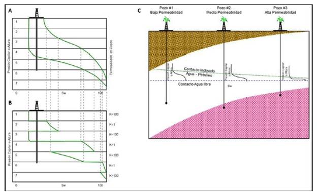 En consecuencia, dicha fuerza condiciona el desplazamiento de la fase humectante (agua) por la fase no humectante (petróleo), constituyéndose en una barrera del movimiento vertical y horizontal. Por otro lado, cambios en el tamaño poral de la roca reservorio pueden relacionarse con cambios en la permeabilidad y conmutación de la presión capilar, estableciéndose variación en el espesor de la zona de transición y la instauración de un contacto agua-petróleo inclinado (Cole, 1961) (Figura 18).