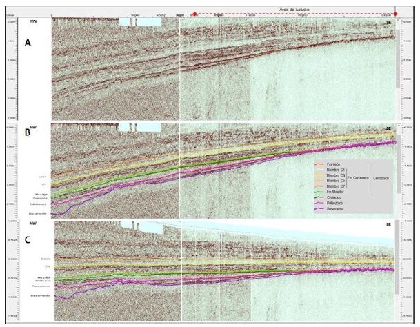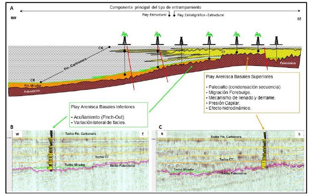 La mencionada situación ha llevado a englobar a estas facies arenosas en una única unidad denominada informalmente como Areniscas Basales, localizadas entre la base de la Formación Carbonera y por encima del Paleozoico en ausencia de secuencias Cretácicas. La interpretación de líneas sísmicas 2D y las correlaciones estratigráficas entre pozos, han permitido propagar una serie de horizontes en la unidad de interés, admitiendo ser divida en 2 subunidades (Figura 6).