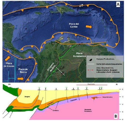 La cuenca de los Llanos Orientales está comprendida entre el frente de deformación de la Cordillera Oriental y el afloramiento del escudo de Guayana. De fuerte configuración morfoestructural asimétrica, presenta en su región occidental el borde plegado y fallado del frente de deformación, y hacia su región oriental el prisma sedimentario del antepaís que apoya sobre el basamento, conformando un homoclinal de suave pendiente, interrumpido por sistemas de fallas de basamento con vergencia predominante hacia el orógeno. La arquitectura actual se debe a la convergencia e interacción de la placa continental Sudamericana, en continua colisión con las placas oceánicas de Nazca y del Caribe (Ramos, 2009) (Figura 2).