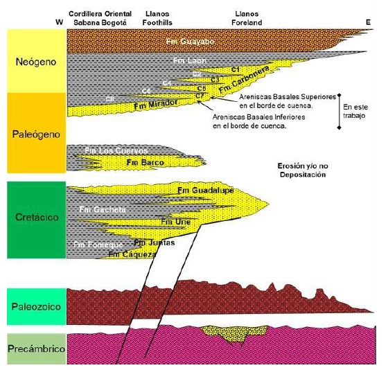A partir de la información disponible (Figuras 4 y 5), es posible reconocer el Basamento, el Paleozoico Inferior, las cuñas sedimentarias del Mesozoico en relación de onlap hacia el Este sobre las unidades precedentes, así como los depósitos del Cenozoico, correspondientes a las unidades litoestratigráficas de la Formación Mirador (areniscas) y Formación Carbonera (alternancia de arenas - miembros C7-C5-C3-C1 y de pelitas - miembros C8-C6-C4-C2) provenientes del cratón (Bayona et al., 2008a; Bande et al., 2012), seguido por los depósitos pelíticos relacionados con la inundación del Mioceno Medio de la Formación León (Bayona et al., 2008b; Reyes-Harker et al., 2015; Duarte et al., 2017), y finalmente la Formación Guayabo constituidas por conglomerados, areniscas, limolitas y arcillas con proveniencia desde la Cordillera Oriental.