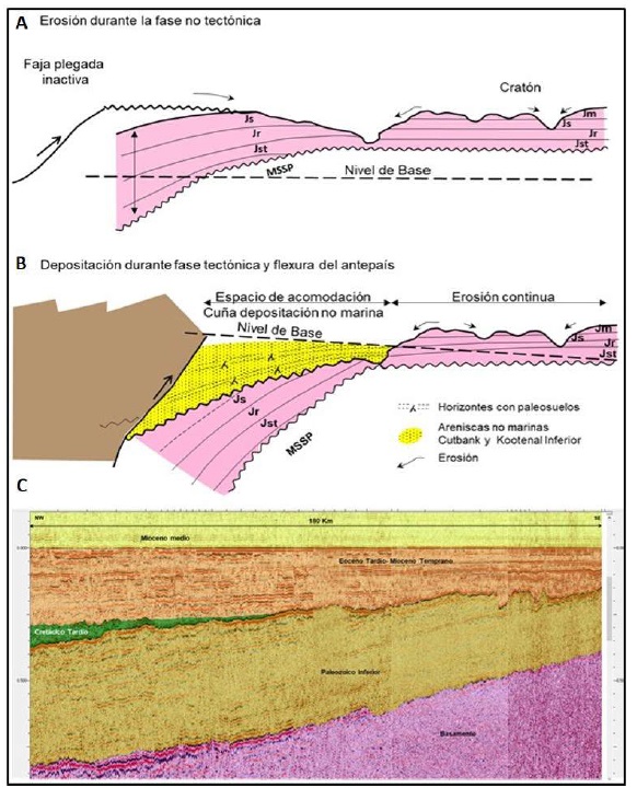 Uno de los rasgos reconocidos durante la fase temprana de la cuenca de antepaís es el desarrollo de la discordancia basal del forebulge, superficie genéticamente asociada con la evolución de la cuenca, localizada en la base del relleno sedimentario (Dolson y Piombino, 1994; Crampton y Allen, 1995). En la cuenca de Llanos, este proceso labró y moldeó una superficie irregular o rugosa sobre las secuencias sedimentarias del Paleozoico inferior, permitiendo que el plano resultante convergiera con las superficies erosivas precedentes (Figura 6).