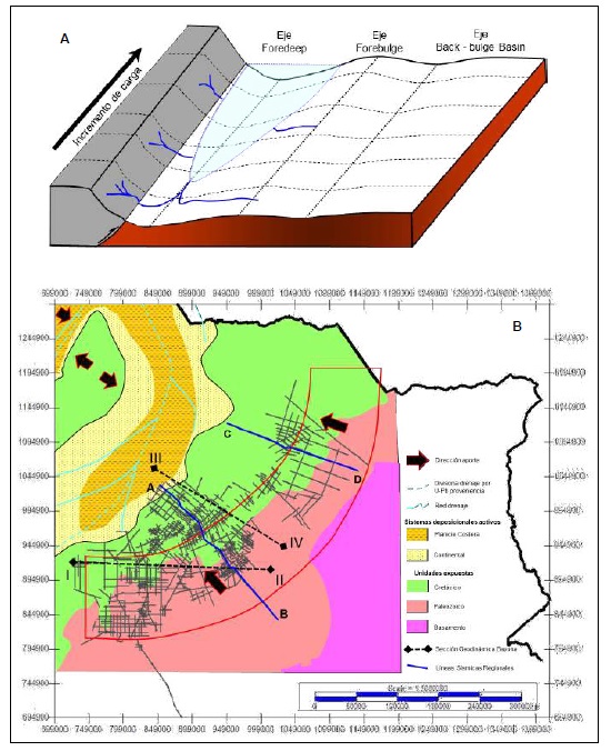 Una profusa bibliografía existe sobre las cuencas de antepaís, tanto para la región de la cuña orogénica como en su depocentro, ya sea desde el punto de vista de la tectónica, de los ambientes sedimentarios y/o su patrón de acumulación (Bande et al., 2012; Bayona et al., 2007, 2008a, 2008b, 2009, 2013; Campos y Mann, 2015; Cooper et al., 1995; Delgado et al., 2012; Horton et al., 2010a, 2010b; Moreno-López y Escalona, 2015; Parra et al., 2005, 2009; Reyes-Harker et al., 2015). En comparación con la región opuesta del borde y el abultamiento periférico de la cuenca donde existen menores divulgaciones o son escasas las referencias.