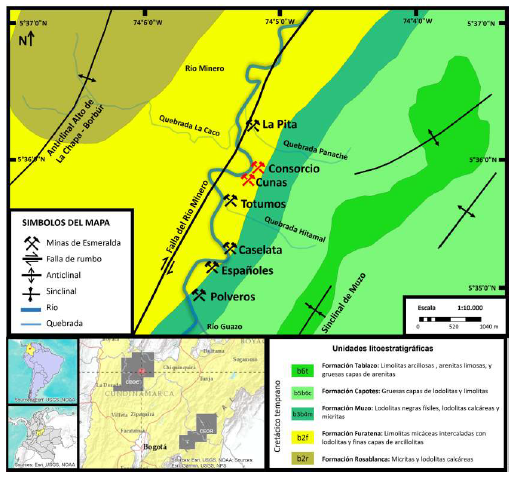 Este trabajo comprende el estudio mineralógico y litoestratigráfico de un yacimiento de esmeraldas ubicado en el occidente del departamento de Boyacá, correspondiente a la mina de Cunas, situada en el distrito minero de Maripí, localizada a 200 km al noroeste de Bogotá. En esta mina hay cuatro túneles, uno de estos denominado Consorcio, colindante con la mina La Pita (Figura 1). En el túnel Consorcio se presenta una sección continua y bien expuesta, con la posibilidad de registrar la distribución composicional y mineralógica presente en las rocas de las formaciones Rosablanca y Paja (Rodríguez y Ulloa, 1994), definidas en el occidente de Boyacá, o sus equivalentes formaciones Furatena y Muzo redefinidas por otros autores que estudiaron la geología del cinturón esmeraldífero occidental (Reyes et al., 2006; Terraza-Melo y Montoya-Arenas, 2011).