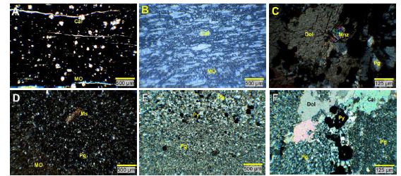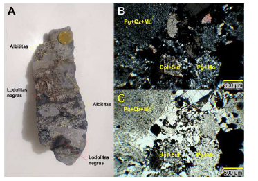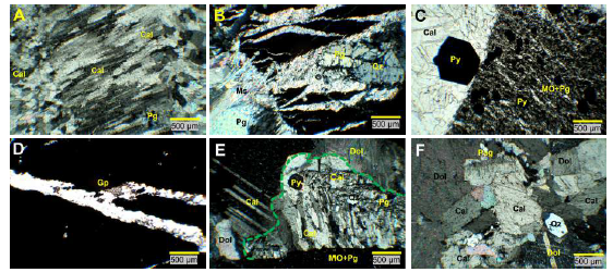 De este análisis se puede inferir que las rocas se pueden clasificar como lodolitas negras con materia orgánica, con venas y venillas de calcita fibrosa. Por otro lado, en la carbonatización II, las lodolitas pasan a formar brechas hidrotermales, mostrando venas de carbonatos romboédricos (calcita y dolomita) que cortan las venas de calcita fibrosa (Figura 8E). Durante esta etapa se introduce cuarzo en paragénesis, así como albita en baja proporción (Figura 8F).