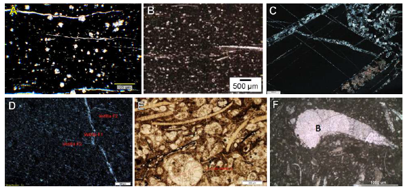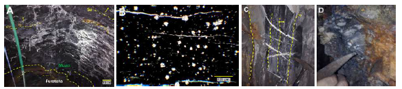 Algunos de los niveles presentan venas y vetillas de pirita (concordantes y tangenciales a la estratificación, con hasta 15 cm de espesor), con colores rojos y amarillos producto de la meteorización. Se observan también venas y vetas de calcita fibrosa tangenciales a casi perpendiculares a la estratificación (Figura 5C), acompañadas en ocasiones de fuchsita, principalmente entre las cotas de 240-280 m medidas desde la base (Figura 2, Figura 3F) de la sección, así como calcita euhedral drusiforme de hasta 10 cm de espesor (Figura 5D).