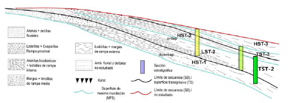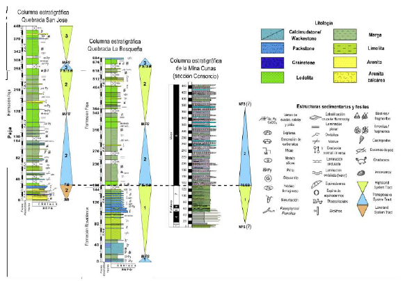 Es posible que exista una MFS en la sección Consorcio, aunque debido a la falta de detalle en el muestreo estratigráfico no se reconoció, siendo probable que parte de los depósitos agradacionales de alto nivel del mar o highstand system tract (HST) estén representados por espesos pantanos intercalados con tormentitas (?) puesto que el segmento 8 preserva capas métricas de arenita, y los cambios de espesor de la Formación Muzo entre Cunas y la sección tipo (Figura 2, Figura 13) pueden deberse a la paleobatimetría conferida por la geometría de grabens y semi-grabens en que se depositaron estas rocas, siendo Cunas un yacimiento de esmeraldas desarrollado en el flanco de una estructura de plegamiento ligada a fault-related fold debido a reinversión tectónica (Branquet et al., 1999).