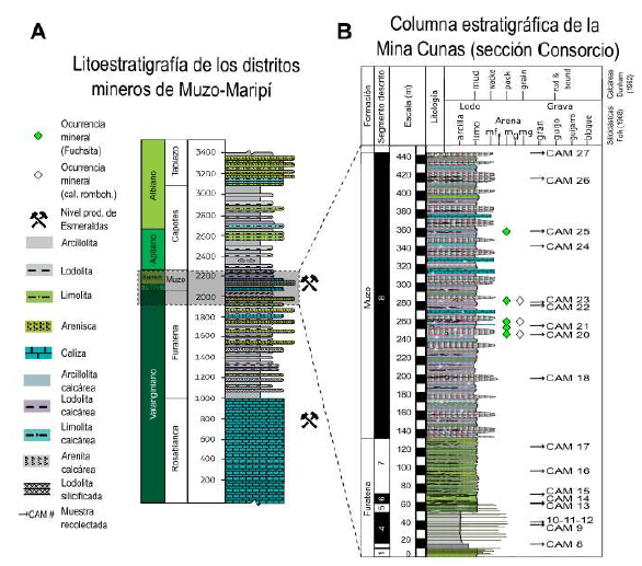 Los segmentos 1 al 7 descritos podrían corresponder a la Formación Furatena, ya que en la sección tipo de esta unidad (Reyes et al., 2006) se describen rocas predominantemente siliciclásticas sin esmeraldas. El contacto entre Furatena y la suprayacente Formación Muzo se considera de carácter gradacional. Este contacto representa el cambio de ambiente marino somero a uno más profundo (posible superficie transgresiva), al pasar de lodolitaslimolitas ricas en micas y alternadas con arenitas de grano medio con pocos niveles calcáreos carbonosos, a lodolitas negras de gran espesor cementadas por carbonatos con niveles que llegan a ser calcáreos sensu estricto, según Dunham (1962), tal como se ve en la Figura 5B. A medida que se asciende en la secuencia estratigráfica, las rocas contienen cada vez más fósiles y sedimentación química notoria, con posible incidencia de tormentas que podrían representar eventos de alta energía, sugerido por la presencia de intercalación de capas de arenitas de grano fino. En el segmento 8 se reconocen vetas de carbonatos mineralizadas, las cuales son productoras de esmeraldas y, por tanto, constituyen una evidencia geológica de que estas rocas corresponden a la Formación Muzo.