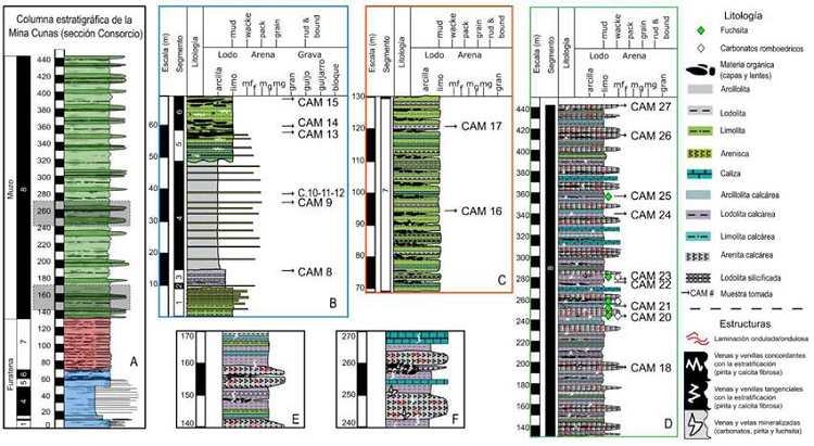 En el túnel Consorcio se encontró y describió una sección estratigráfica de 444 metros de espesor, la cual muestra una secuencia de rocas de composición siliciclástica a mixta, compuesta por lodolitas, limolitas y arcillolitas negras y grises intercaladas con capas decimétricas y métricas de arenitas de grano muy fino a medio. Algunas capas poseen composición calcárea y tienen pocos centímetros de espesor. Con base en sus características y escala (1:1000), la sucesión sedimentaria se subdividió en 8 segmentos (Figura 3A).