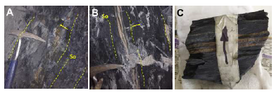 Formación Furatena: el segmento 1 (Figura 3B) presenta 8,8 m de espesor total conteniendo limolitas negras micáceas intercaladas con paquetes de arenitas de grano muy fino de hasta 40 cm de espesor; sobre este se reconoce el segmento 2 (el más fino de la secuencia) (Figura 3B), el cual consta de apenas 1,7 m de lodolitas negras con laminación plano paralela, intercaladas con capas de arenita muy fina a fina de hasta 20 cm de espesor y láminas de material carbonoso que le da al material de este segmento un aspecto bituminoso. El segmento 3 (Figura 3B) consta de 4 m de lodolitas negras que se caracterizan por la presencia de pirita microcristalina (a veces reconocible en muestra de mano) con patinas ferruginosas de color anaranjado y rojizo (Figura 4A), las cuales están suprayacidas por 34,4 m (segmento 4) de arcillolitas negras silíceas con laminación plano paralela, intercaladas con capas de arenitas de grano fino-medio de hasta 30 cm de espesor (Figura 3B). En este segmento se observa la ocurrencia de pirita, en venillas concordantes con la laminación (Figura 4B, 4C).