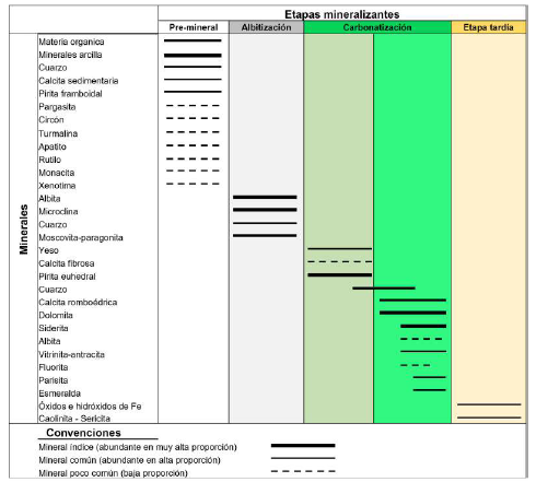 En la mina de Cunas hay cinco etapas de mineralización: 1) premineral que conserva estructuras relícticas en rocas de la Formación Muzo; 2) albitización debido al metasomatismo sódico donde cristalizan albita, microclina y moscovita-paragonita; 3) carbonitización (I) donde se introducen venas de calcita fibrosa, pirita euhedral y yeso; 4) carbonitización (II) que dio lugar a la maduración térmica de materia orgánica incidente en la reducción temprana del sulfato, formando brechas de venas de calcita-dolomita romboédricas, cuarzo, moscovita rica en Cr (fuchsita?), fluorita, parisita y esmeralda; y 5) etapa tardía favorecida por brechamiento, formando óxidos e hidróxidos de hierro y probablemente caolinita-sericita.