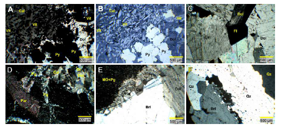 En la muestra REOCU-170 se identifica materia orgánica dentro de venas de carbonatos romboédricos; la cual tiene alta madurez térmica (alta reflectancia) por lo que puede ser clasificada como vitrinita (vitrodetrinita, telinita y colotelinita), ya que preserva estructuras vegetales (Figura 9A, 9B). Estudios de campo y petrográficos indican que los fragmentos de materia orgánica son posteriores a los piritoedros, anteriores al cuarzo y están en paragénesis con calcita-dolomita. Al final de la carbonatización (II) aparecen en paragénesis fluorita, parisita y esmeralda, ya que las rocas que contienen esmeralda en la mina Cunas siempre contienen los dos primeros minerales, en proporción variable (Figura 9C, 9D, 9E). Así, la esmeralda se presenta petrográficamente como cristales puntuales, corroyendo moscovita-paragonita rica en Cr (fuchsita?), o en intercrecimiento gráfico con cuarzo (Figura 9F).