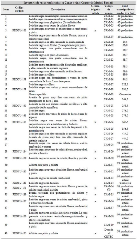 Se recolectaron ciento veinte muestras en total, se referenciaron diecinueve en la columna estratigráfica de la sección Consorcio (se indica la cota en metros en que se recolectó), quince muestras en la sección Consorcio no referenciadas (se desconoce la cota), seis en el nivel 40 (cota en profundidad en metros del túnel Bocamina inclinado Cunas) y ochenta en el nivel 90 (Bocamina inclinado Cunas). La Tabla 1 agrupa diecinueve muestras en la columna de la sección Consorcio, trece en el nivel 90, seis en el nivel 40 y dos en la sección Consorcio no referenciadas. El consecutivo CAM hace referencia a Cunas Andrés Martín, mientras que REOCU es una nomenclatura usada internamente en el CDTEC para denominar muestras procedentes de la mina Cunas.