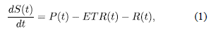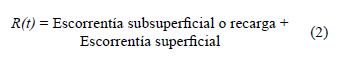 Donde S(t) es el cambio en el almacenamiento en función del tiempo, P(t) es la precipitación total anual (mm/año), ETR(t) es la evapotranspiración real (mm/ año) y R(t) corresponde a la escorrentía (mm/año), que puede entenderse como: