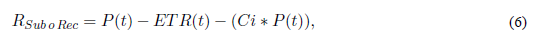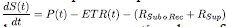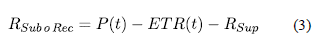 Donde RsuboRec corresponde a la recarga, P(t) es la precipitación en mm/año, ETR(t) es la evapotranspiración real y RSUp corresponde a la escorrentía superficial. Finalmente, el resultado de la ecuación 3 corresponderá a la fracción de agua que finalmente llega a recargar las unidades acuíferas y se considerará como una recarga potencial pues no considera la variación en el almacenamiento ni el agua que se encuentra almacenada por capilaridad.