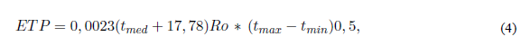 El cálculo de la evapotranspiración representa la principal salida de agua de un sistema, por lo tanto, son necesarias algunas simplificaciones para su determinación, la evapotranspiración real (ETR) puede ser calculada a partir de la evapotranspiración potencial (ETP) que asimila las condiciones más favorables. Con la finalidad de dar solución a la ecuación 3 se calculó en primer lugar la variable ETP, mediante la metodología de la fórmula simplificada Hargreaves y Samani (1985):