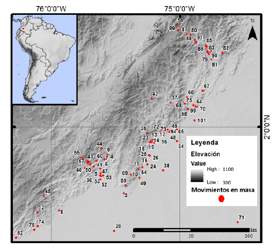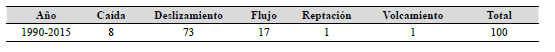 Se recopilaron reportes de movimientos en masa de las bases de datos SIMMA (http://simma.sgc.gov.co), el cual corresponde a un sistema de información público de movimientos en masa a cargo del SGC, y la base de datos del Desinventar (https://www.desinventar.org/es), el cual es un sistema de adquisición, consulta y despliegue de información sobre desastres para América Latina. Se obtuvo un total de 100 reportes en un periodo comprendido a partir de enero de 1990 y diciembre de 2015, cada registro cuenta con información sobre base de datos en la cual se reportó fecha de ocurrencia del evento, número de muertos, desaparecidos, viviendas destruidas y afectados, coordenadas geográficas y tipo de movimiento en masa reportados según la clasificación de la entidad encargada del reporte (Tabla 1).