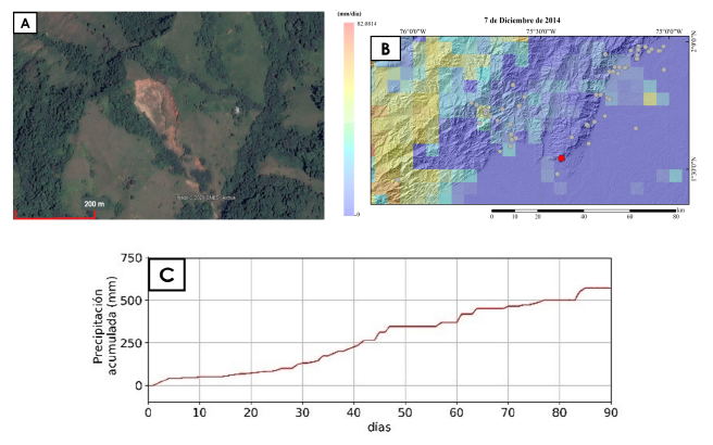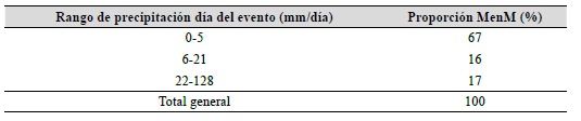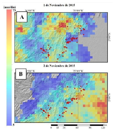 La intensidad de lluvia diaria estimada por el programa CHIRPS para cada día en el que se detonó un movimiento en masa en la zona varía entre 0 y 128 mm (Tabla 2).